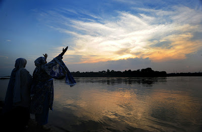 Pakistani women pray at sunset by the Ravi river in Lahore